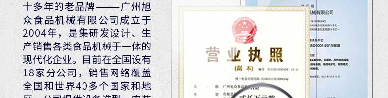 廣州旭眾食品機(jī)械有限公司是一家集科研開(kāi)發(fā),生產(chǎn)設(shè)計(jì),營(yíng)銷(xiāo)服務(wù)為一體的現(xiàn)代化生產(chǎn)企業(yè)?,F(xiàn)代化生產(chǎn)車(chē)間,精湛制造技術(shù),所產(chǎn)機(jī)械歷經(jīng)市場(chǎng)重重考驗(yàn),不斷贏得海內(nèi)外客戶(hù)的贊譽(yù)。