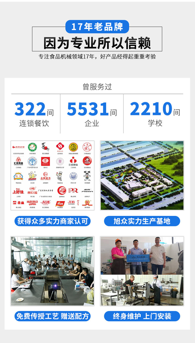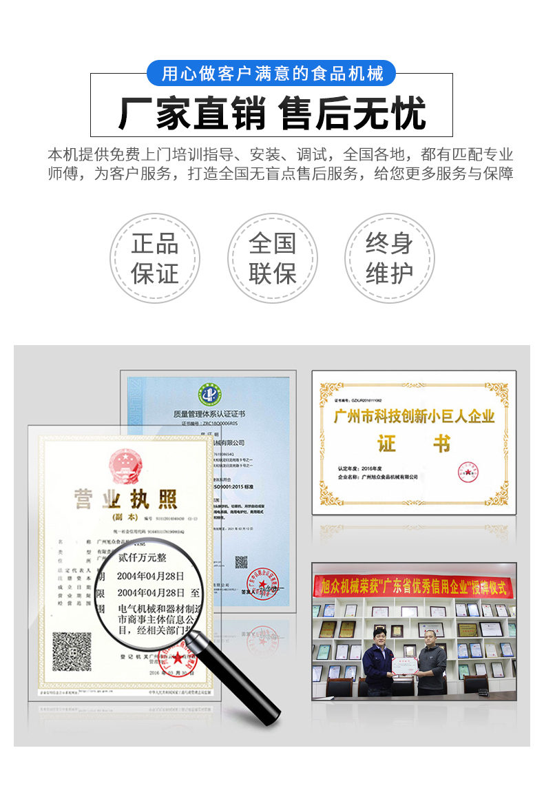 廣州旭眾食品機(jī)械有限公司是一家集科研開(kāi)發(fā),生產(chǎn)設(shè)計(jì),營(yíng)銷服務(wù)為一體的現(xiàn)代化生產(chǎn)企業(yè)?,F(xiàn)代化生產(chǎn)車間,精湛制造技術(shù),所產(chǎn)機(jī)械歷經(jīng)市場(chǎng)重重考驗(yàn),不斷贏得海內(nèi)外客戶的贊譽(yù)。