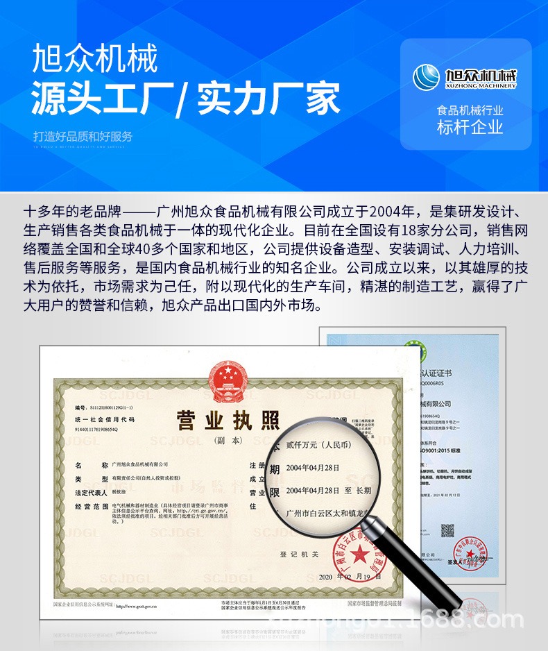 廣州旭眾食品機(jī)械有限公司是一家集科研開發(fā),生產(chǎn)設(shè)計(jì),營銷服務(wù)為一體的現(xiàn)代化生產(chǎn)企業(yè)。現(xiàn)代化生產(chǎn)車間,精湛制造技術(shù),所產(chǎn)機(jī)械歷經(jīng)市場重重考驗(yàn),不斷贏得海內(nèi)外客戶的贊譽(yù)。
