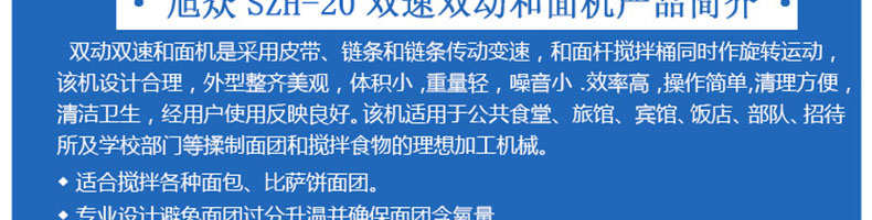 SZH-20型雙速雙動和面機,本機適合攪拌各種面包、包子、饅頭、湯圓、披薩餅面團,專業(yè)設計避免面團過分升溫并確保面團含氧量。過載、缺相保護裝置,防護罩安全連動裝置。