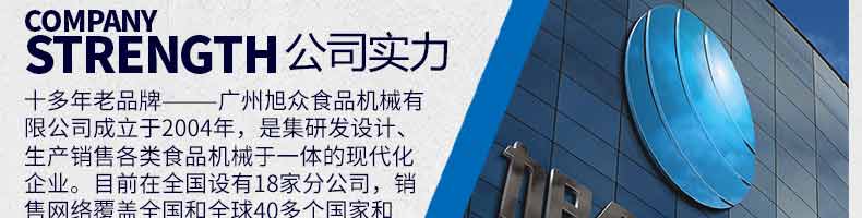 廣州旭眾食品機(jī)械有限公司是一家集科研開(kāi)發(fā),生產(chǎn)設(shè)計(jì),營(yíng)銷服務(wù)為一體的現(xiàn)代化生產(chǎn)企業(yè)。現(xiàn)代化生產(chǎn)車間,精湛制造技術(shù),所產(chǎn)機(jī)械歷經(jīng)市場(chǎng)重重考驗(yàn),不斷贏得海內(nèi)外客戶的贊譽(yù)。
