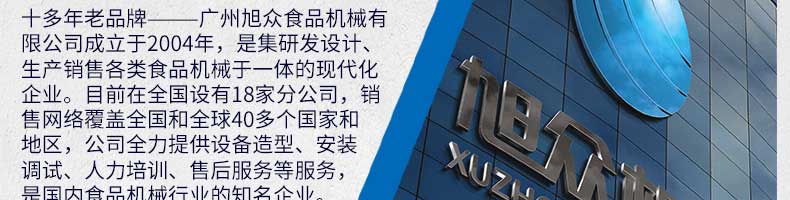 廣州旭眾食品機(jī)械有限公司是一家集科研開發(fā),生產(chǎn)設(shè)計(jì),營(yíng)銷服務(wù)為一體的現(xiàn)代化生產(chǎn)企業(yè)?,F(xiàn)代化生產(chǎn)車間,精湛制造技術(shù),所產(chǎn)機(jī)械歷經(jīng)市場(chǎng)重重考驗(yàn),不斷贏得海內(nèi)外客戶的贊譽(yù)。