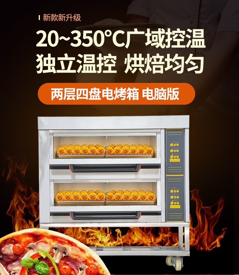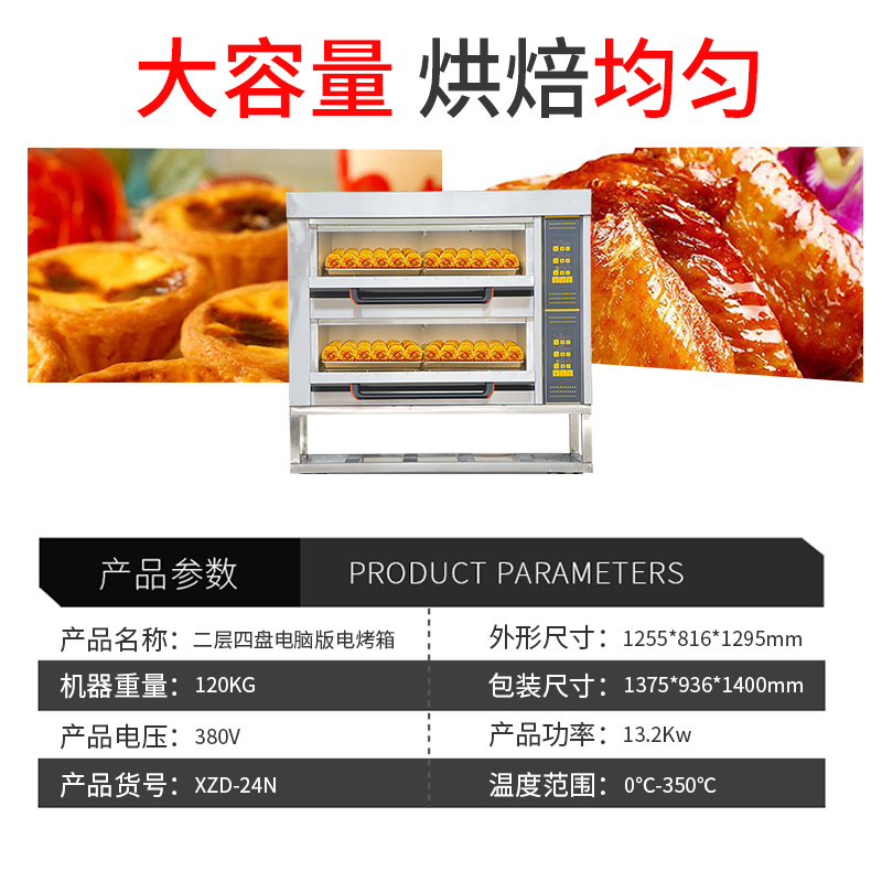 名稱二層四盤電腦版電烤箱 電源380V 功率13.2Kw 產(chǎn)量 尺寸1255*816*1295mm 重量120KG 規(guī)格兩層四盤 其他