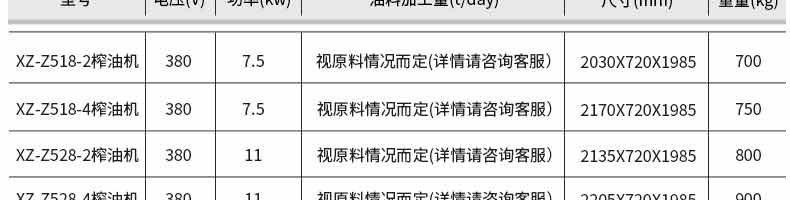 名稱XZ-Z518、XZ-Z528、XZ-Z538系列榨油機(jī) 電源380V 功率視型號(hào)而定7.5~18.5KW請(qǐng)下拉可查明細(xì) 產(chǎn)量視原料情況而定 尺寸視型號(hào)而定2030*720*1985mm~2450*790*2050mm請(qǐng)下拉可查明細(xì) 重量視型號(hào)而定700~1200KG請(qǐng)下拉可查明細(xì) 規(guī)格 其他